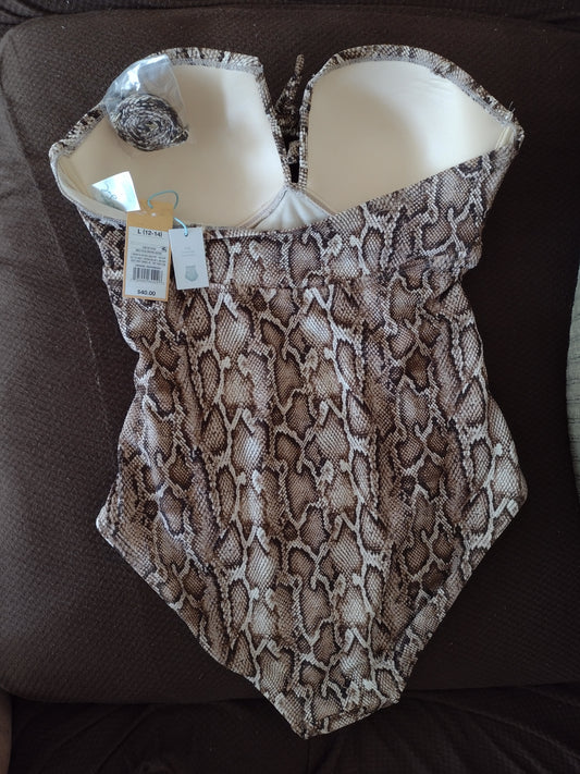 Women's One-Piece Swimsuit Beige & Brown Snakeskin Pattern Size L (12-14)